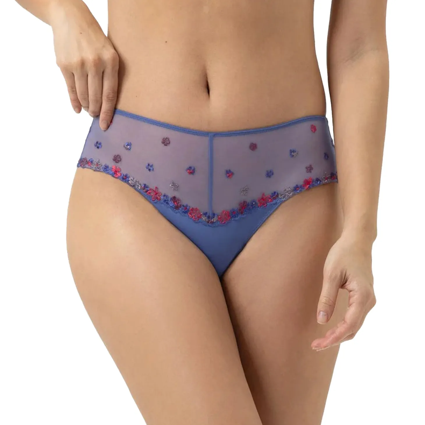 - Design: These blue bikini briefs feature a sheer mesh waistband delicately embroidered with scattered floral motifs in red, blue, and lilac tones. A floral lace trim runs along the leg openings, while the back is crafted from smooth, seamless fabric for a flattering fit.