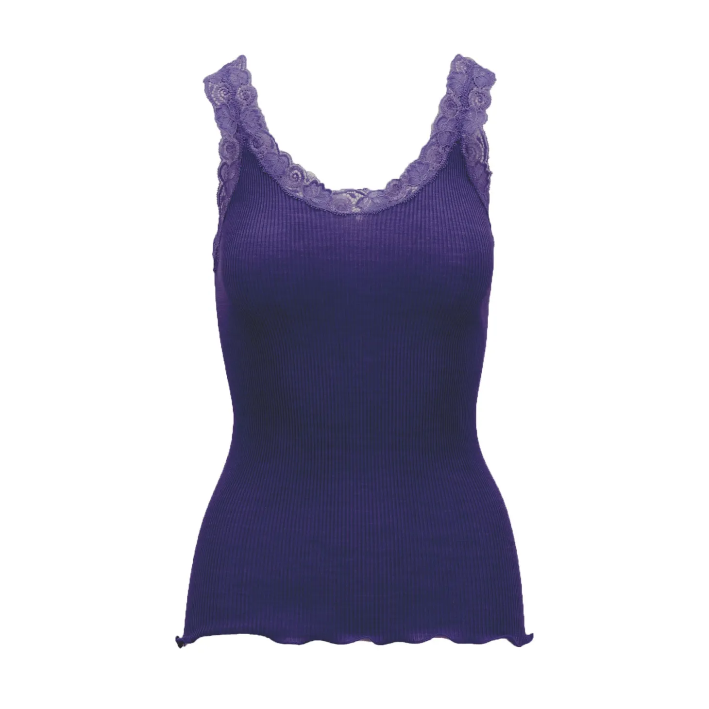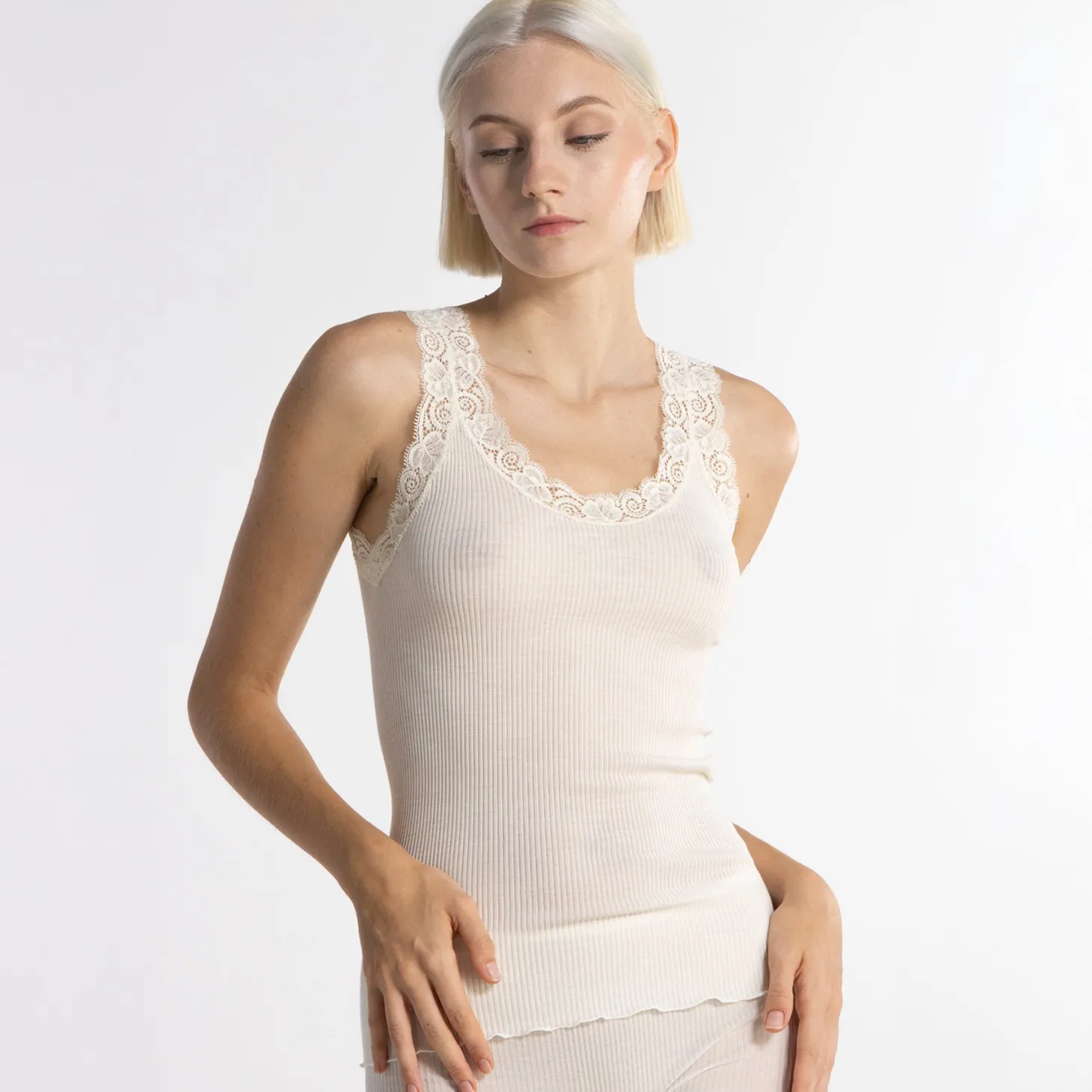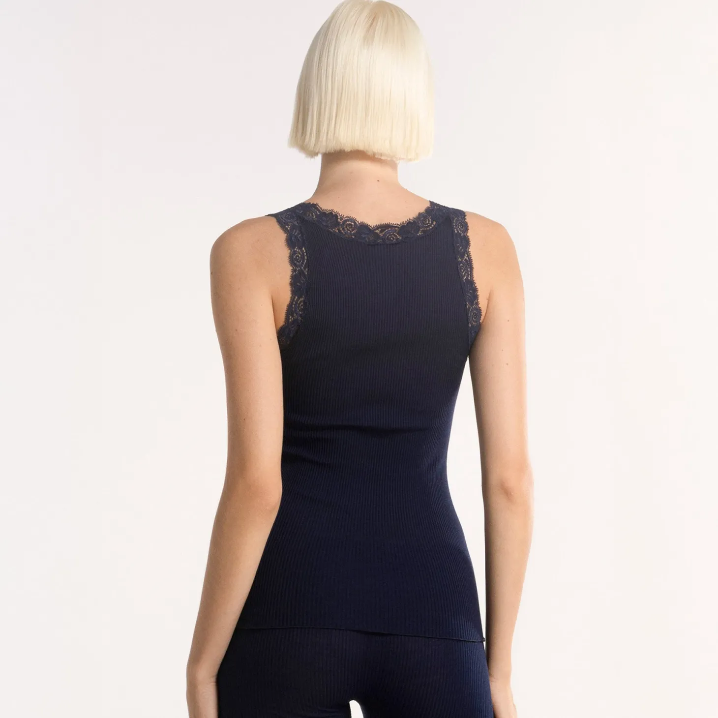 - Style: Ribbed Tank Top with Leavers Lace Trim