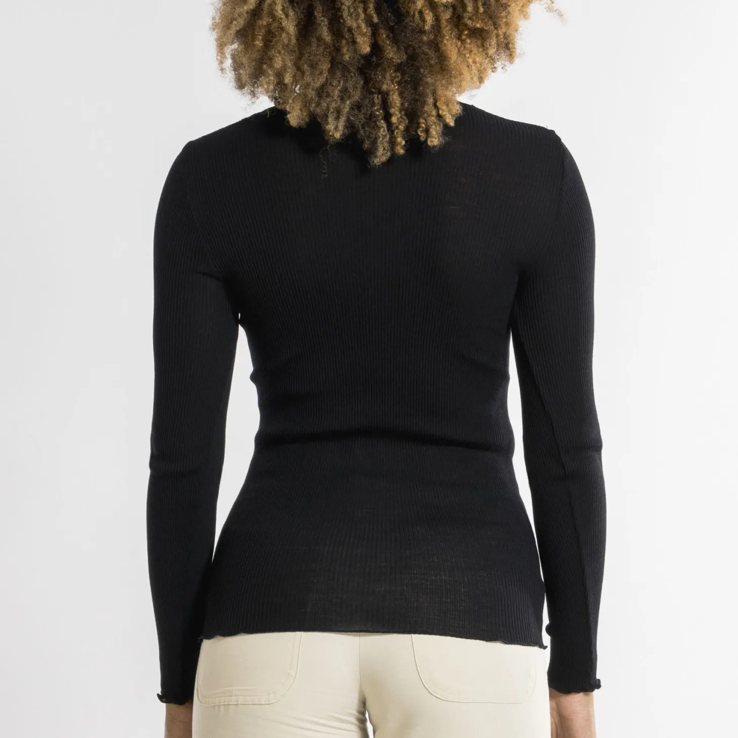 - Design: Long-sleeved ribbed top made of a precious and natural intimate blend of Merino Extra Fine Wool and top quality Silk, featuring a romantic and elegant Leavers Lace neckline. Rib knit fabric for an incredibly warm and soft feel and a perfect embrace on your body.