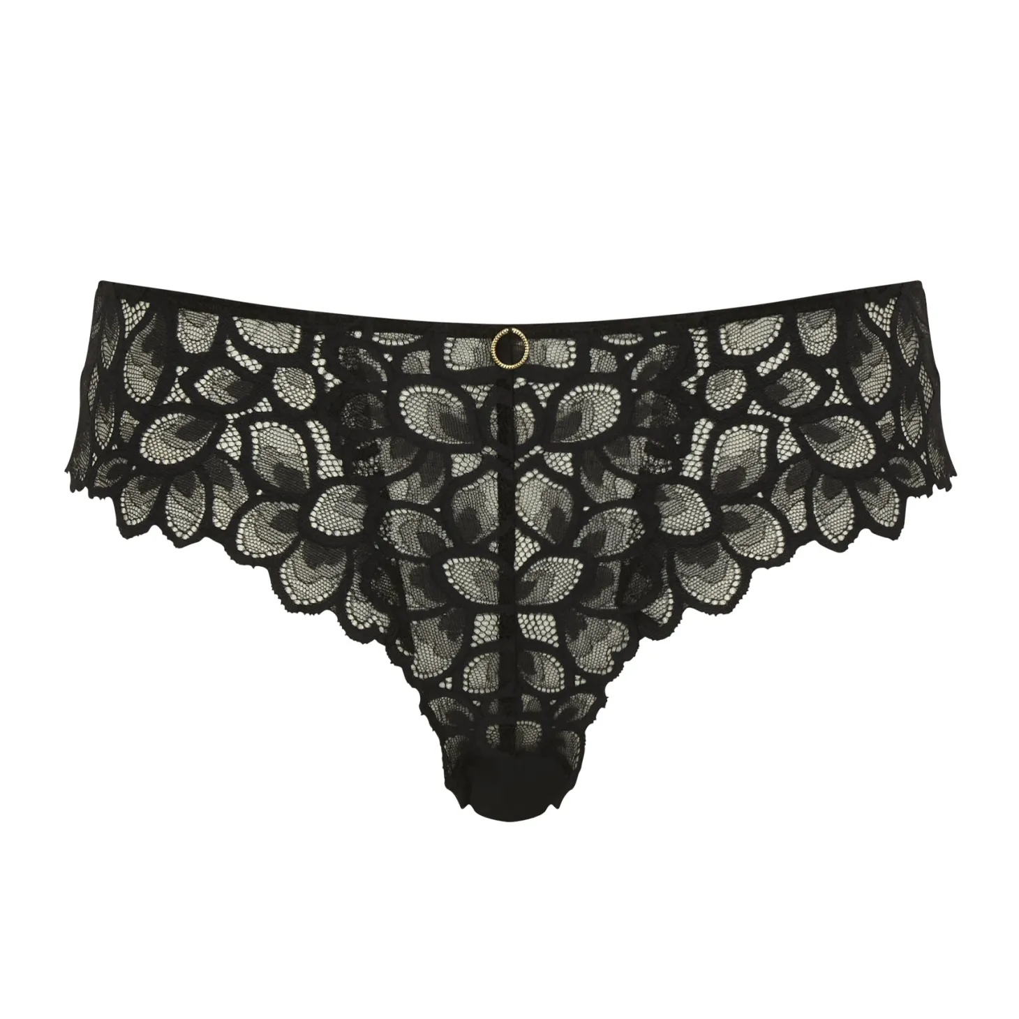 - Design: This thong is designed with sheer floral lace, scalloped edges, and a delicate gold ring accent at the front.