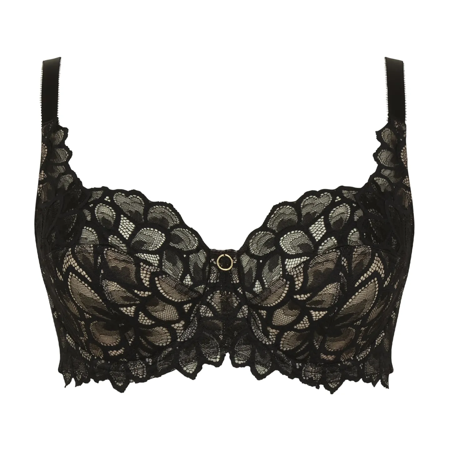 - Design: This full coverage bra is crafted in intricate floral lace with scalloped edges and a gold ring detail at the centre front. Wired, non padded. Recycled sheer black lace. Inner side sling gives extra uplift and support. Power mesh wings give comfortable support around the body across all cup sizes. Fully adjustable straps.