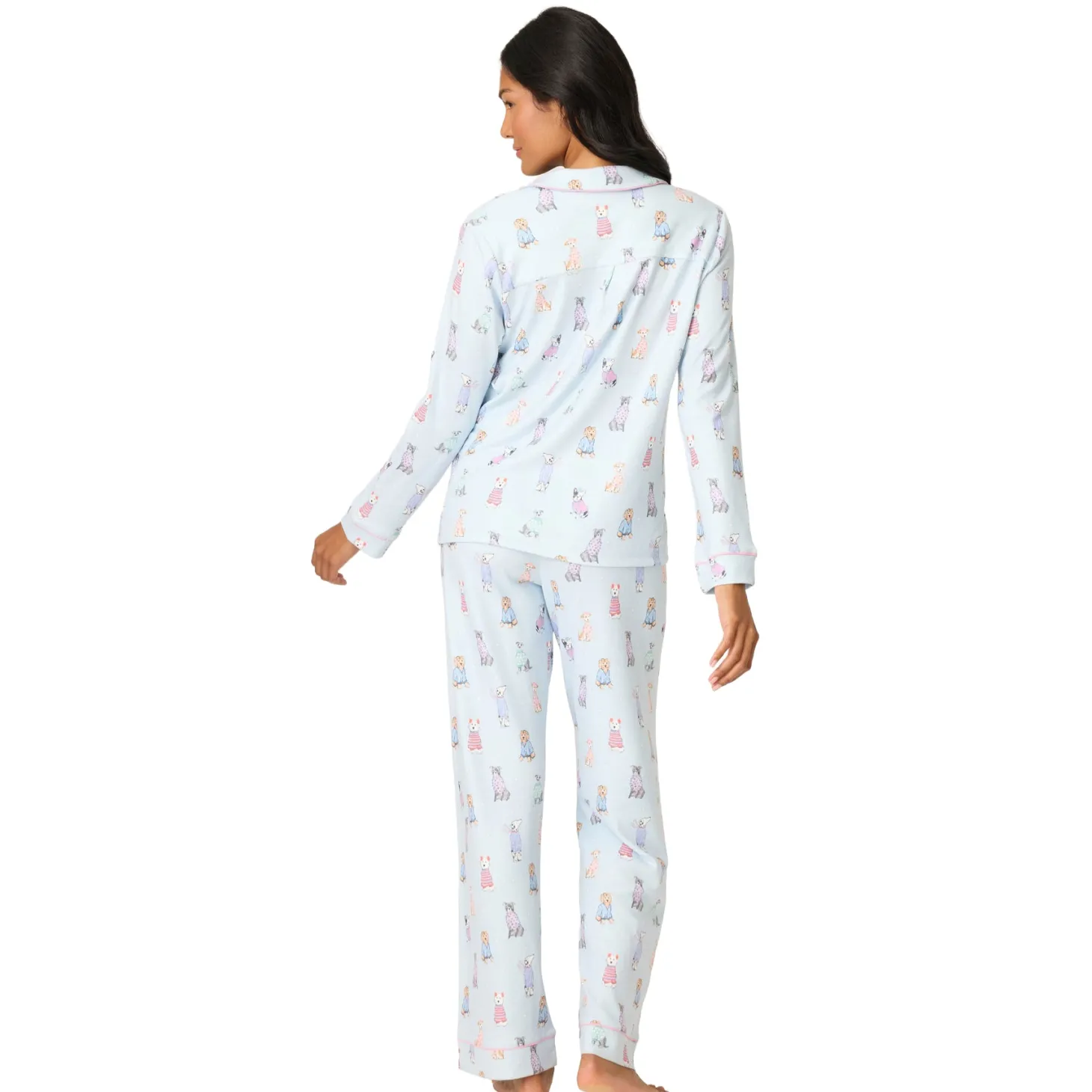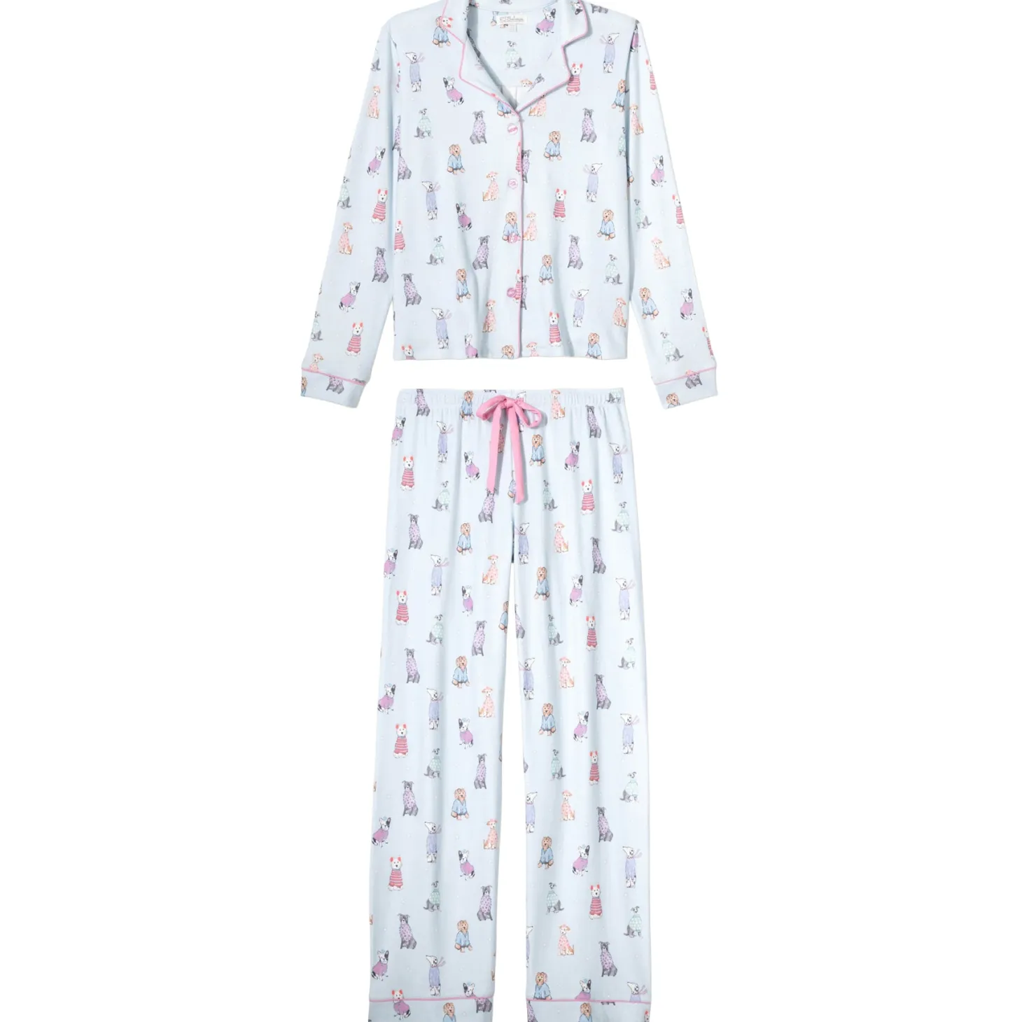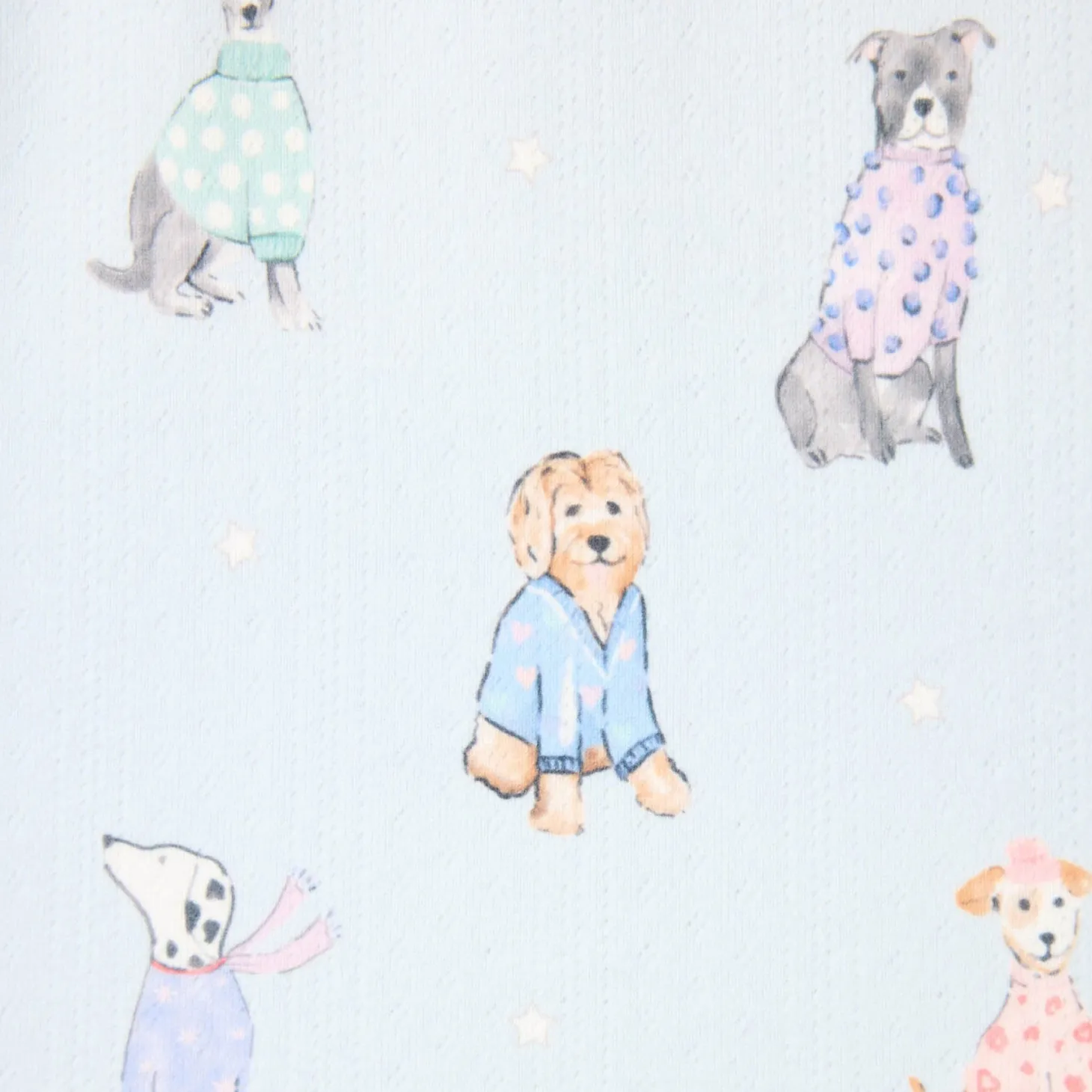 Paw-sitively cozy and snow much fun, this pajama set is crafted from double-brushed pointelle with a light blue backdrop dotted in playful pups dressed for winter.