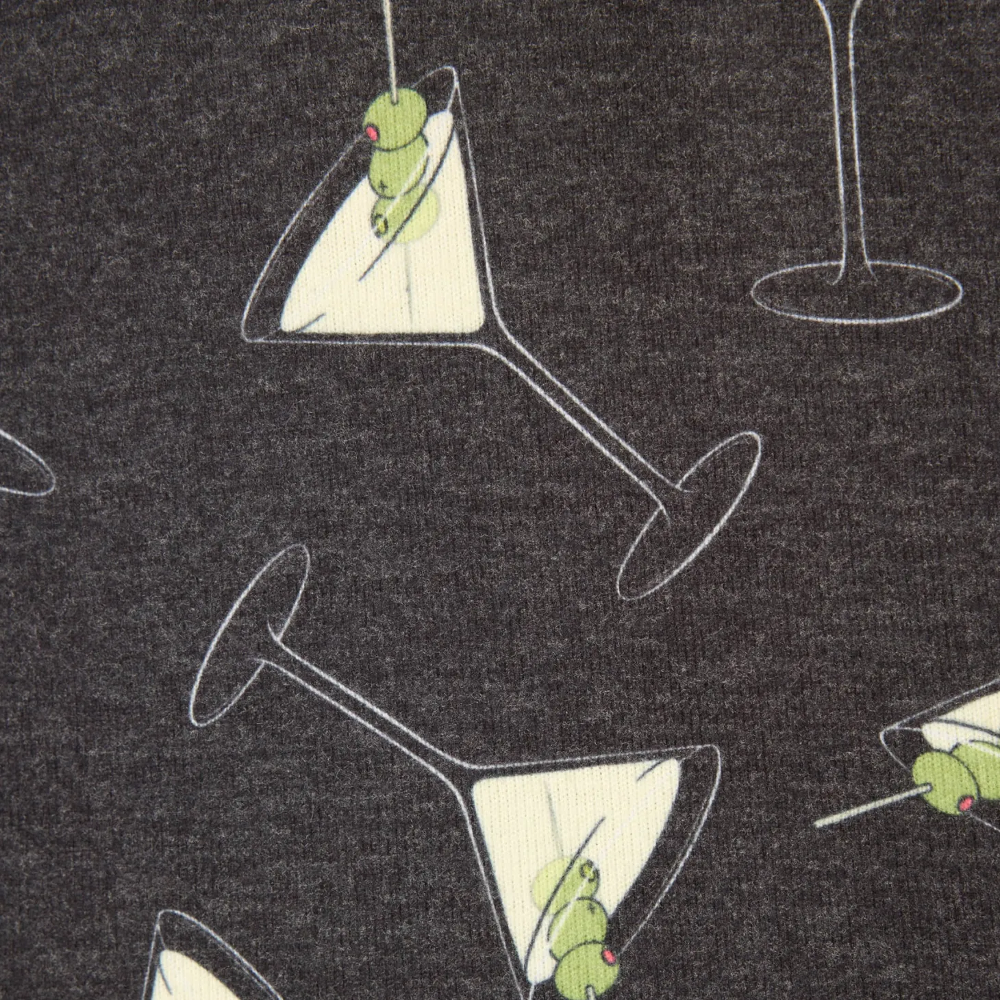- Design: Charcoal knit patterned with clean martini illustrations, paired with a relaxed long-sleeve top and jogger-style pants featuring a drawstring waist and soft cuffing.
