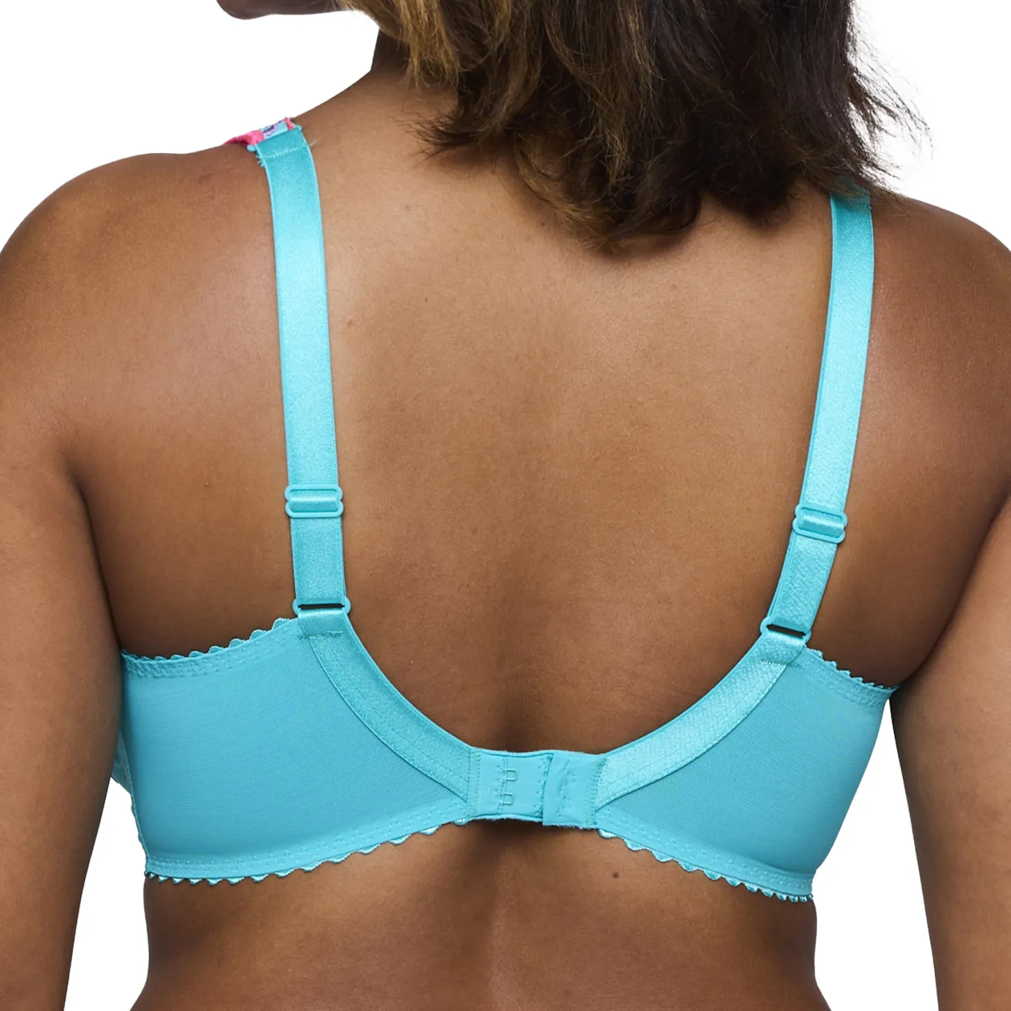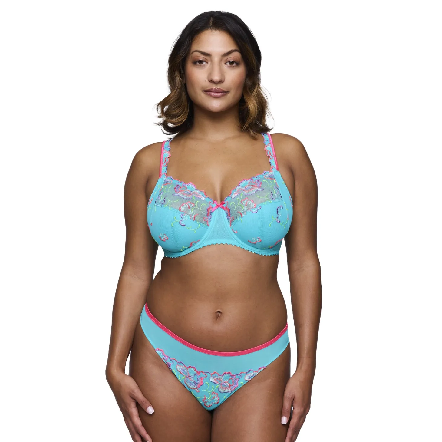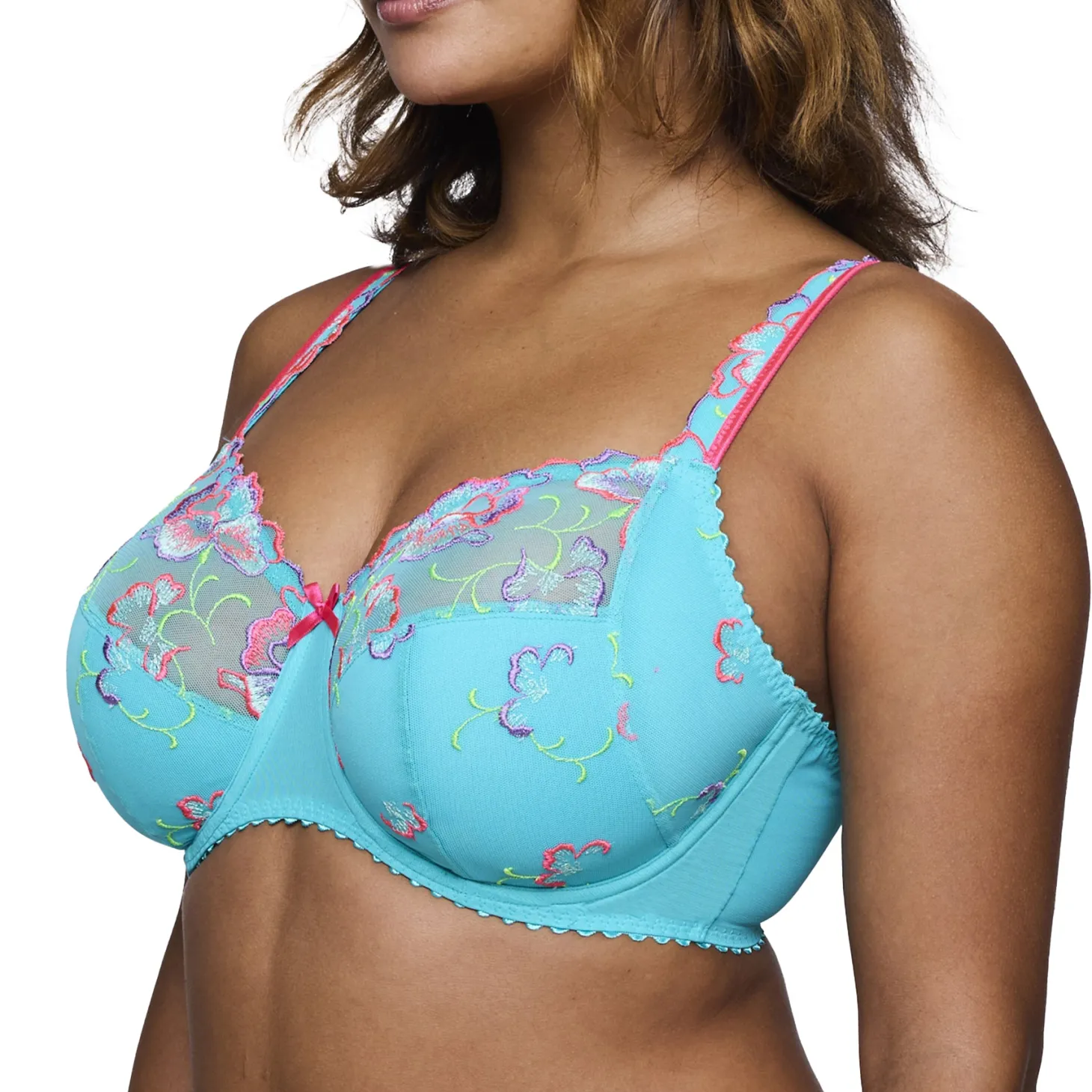 - Design: A sexy and comfortable full-cup bra with colorful all-over embroidery that continues onto the straps. The contrasting trim adds the finishing touch. The cheery colors of Velvet Blue flatter your figure thanks to the neon pink floral bouquet on a dark blue background.