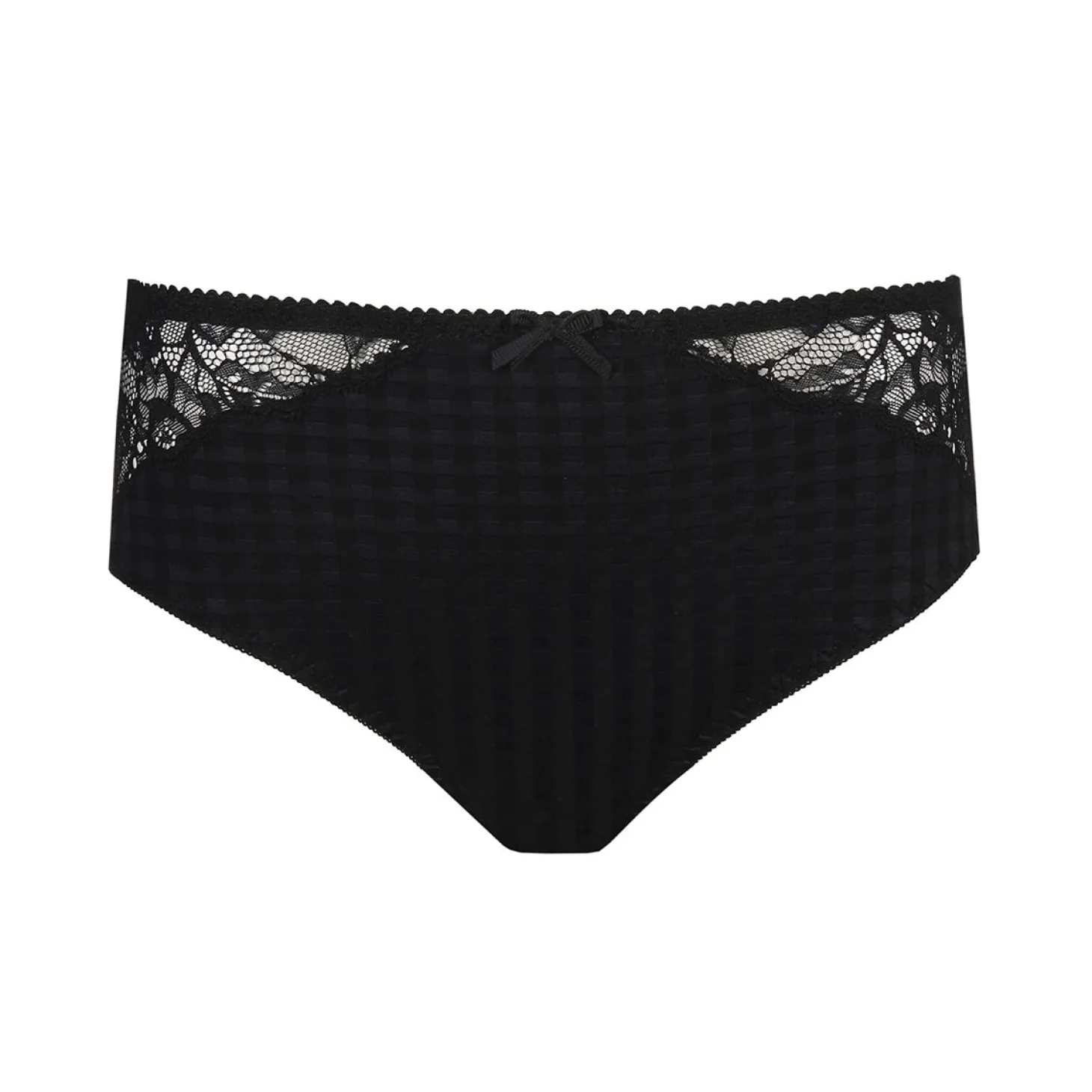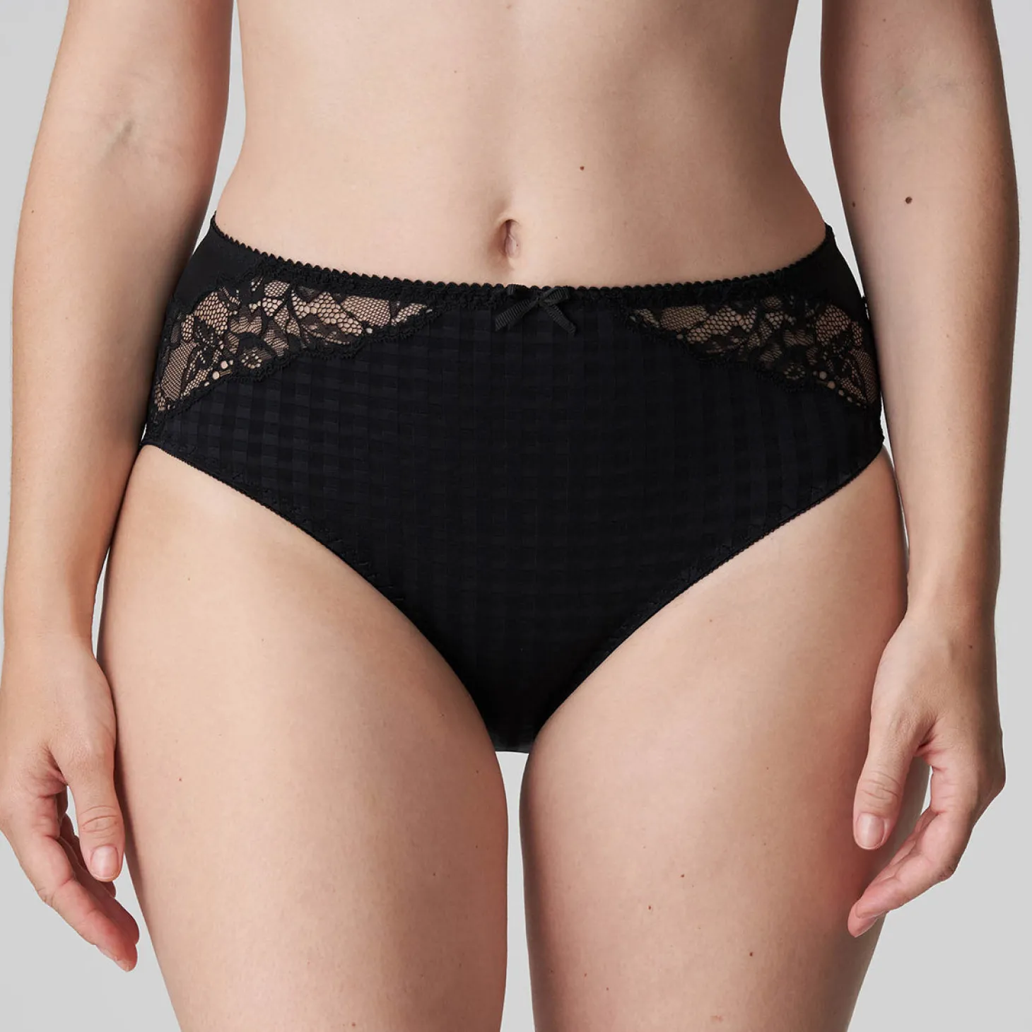 The PrimaDonna Madison collection offers the ultimate in fashion, luxury, and divine comfort. Elegant and comfortable high-waisted briefs in a gingham fabric with a luxurious lace trim at the legs