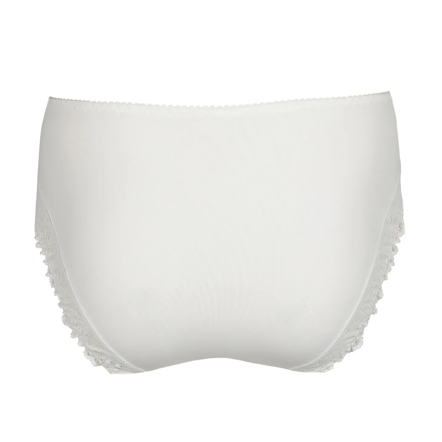 - Design: This full brief features a smooth, high-rise silhouette in crisp white, accented with delicate lace insets along the hips and back legs for a feminine finish that’s both flattering and stylish.