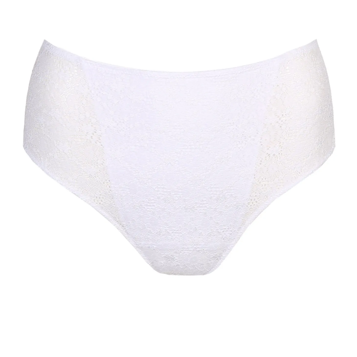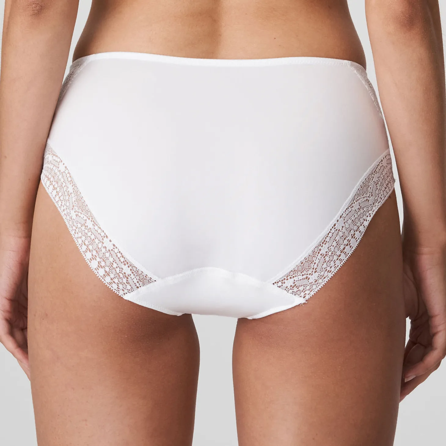 Super-feminine, high-waisted briefs with lace and a seventies print. The back panel is made from satin-look fabric and is adorned with eyelash lace on the bottom. Vintage lace in crisp white is stylish, feminine, and perfect for summer brides!