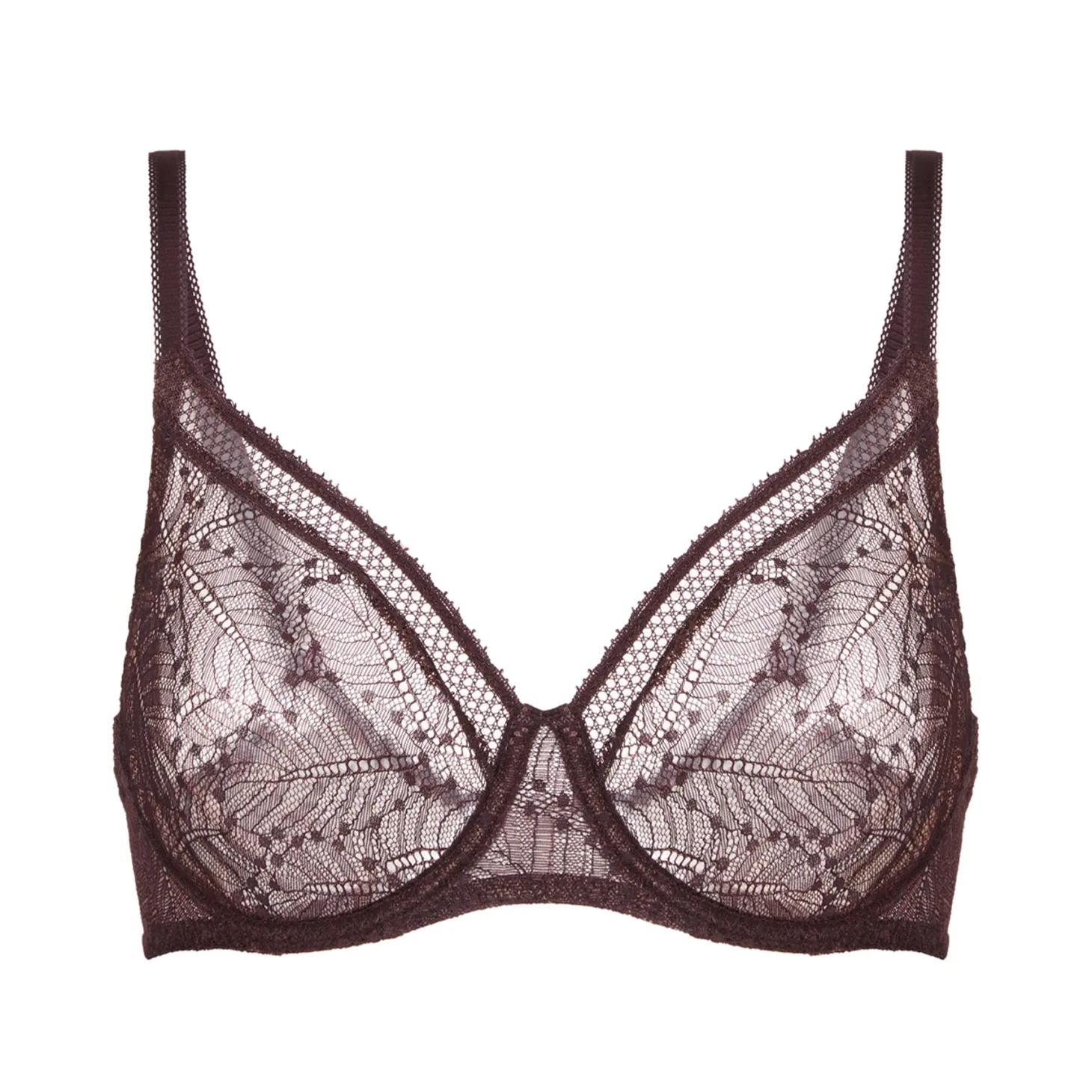 - Design: Full coverage bra with underwire. Unlined semi-sheer cups with inner tulle lining for support and shaping. Curve-hugging lace stretches and moves with you and lays flat under clothing for a seamless look. Cups lined with tulle for comfort and additional support. Top of cup elasticized for a curve-hugging fit. Lace band with scalloped trim. U-shaped ballet back provides support while smoothing the back. Straps can be worn in two ways: classic or criss-cross. Hook-and-eye back closure.