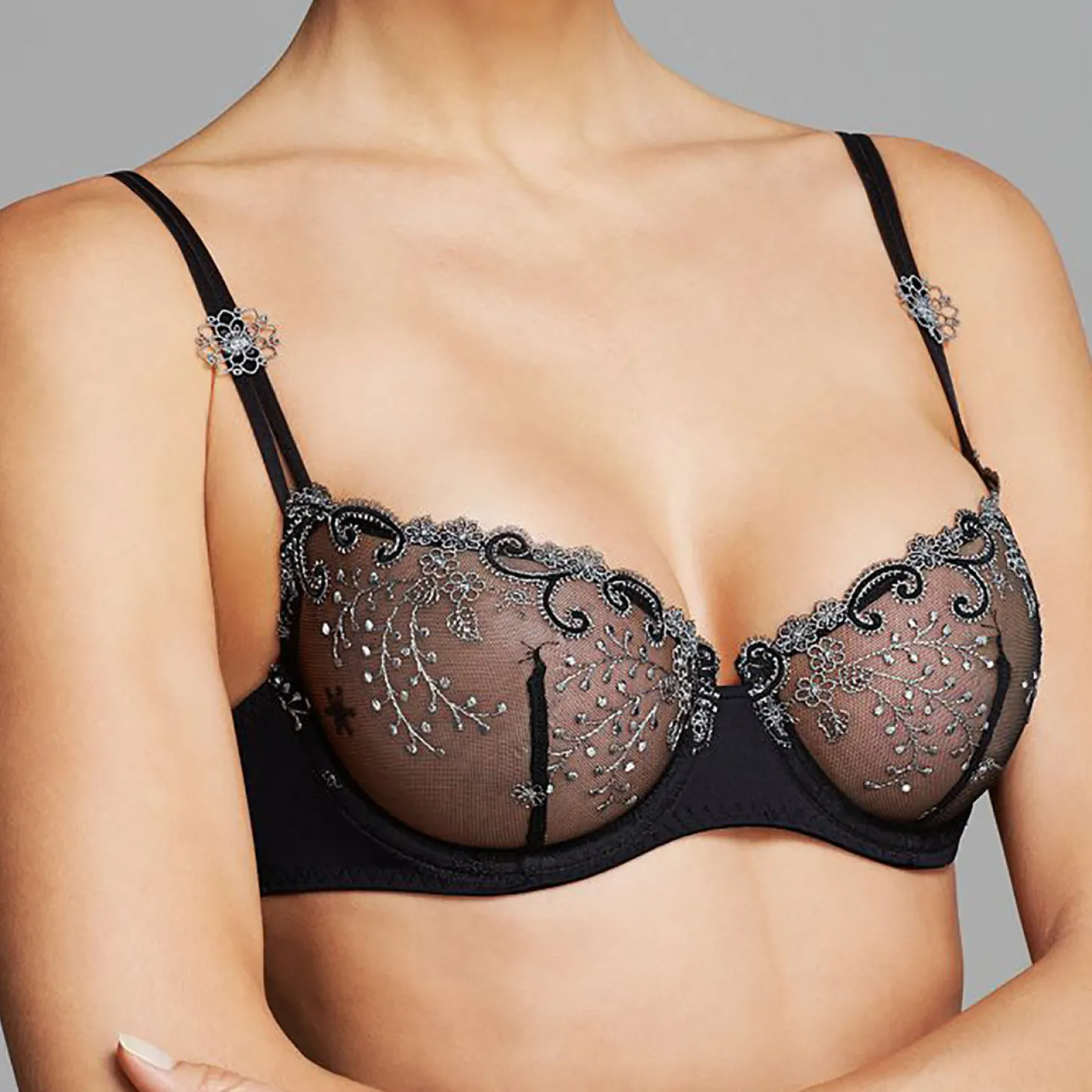 - Design: The cup is made of Austrian embroidery lace on stretch tulle with some guipure and Swarovski crystals. Small delicate embroidered applique flowers are affixed to the straps to create a feminine and luxurious finish.