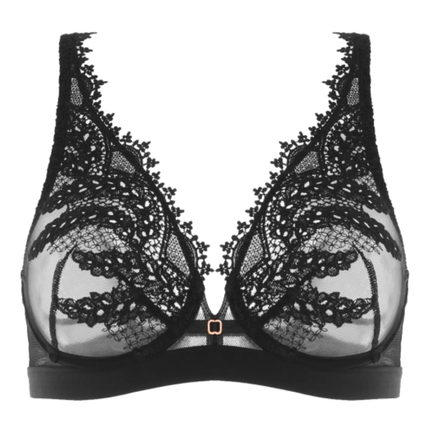 - Design: Guipure embroidered underwire triangle bra. Ultra plunging neckline decorated with scalloped embroidery. Sheer cups in guipure embroidery with vertical seam for a round shape. Thin center front in sheer tulle with a gold hardware accent. Crepe under bust band . Straight back band in tulle, lined from D cup for extra support. Straps are decorated with guipure on the front. Adjustable straps with gold hardware on the back.