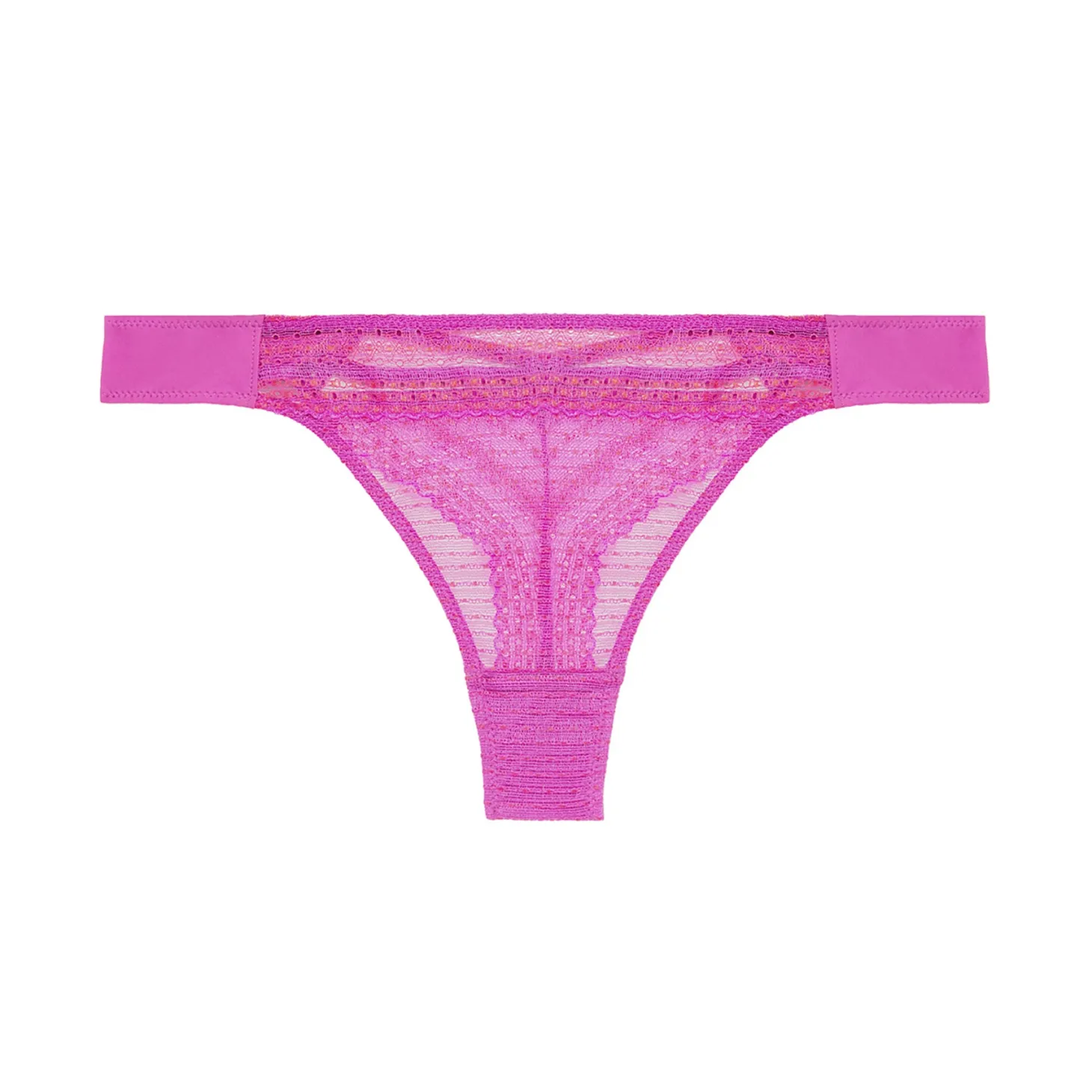 Sweet eyelet-patterned lace meets bold corset-inspired design in the modern Pia Thong. This playful, minimalist g-string crafted from sheer French lace and stretch crepe. Featuring a striking corset-like back – perfectly paired with low-cut jeans. Scalloped trims positioned to enhance derrière curves ensure these low-waist briefs are invisible under clothing.