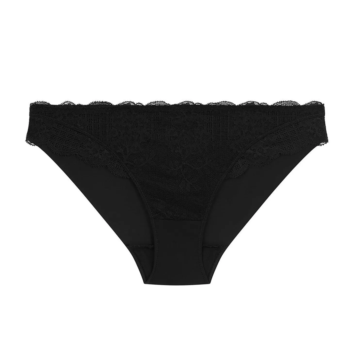 - Design: Lace and microfiber bikini. Lace front with scalloped trim on waist and top of thighs, cotton lining. Mesh back with seamless finish for invisibility under clothes. Oeko-Tex® certified materials.