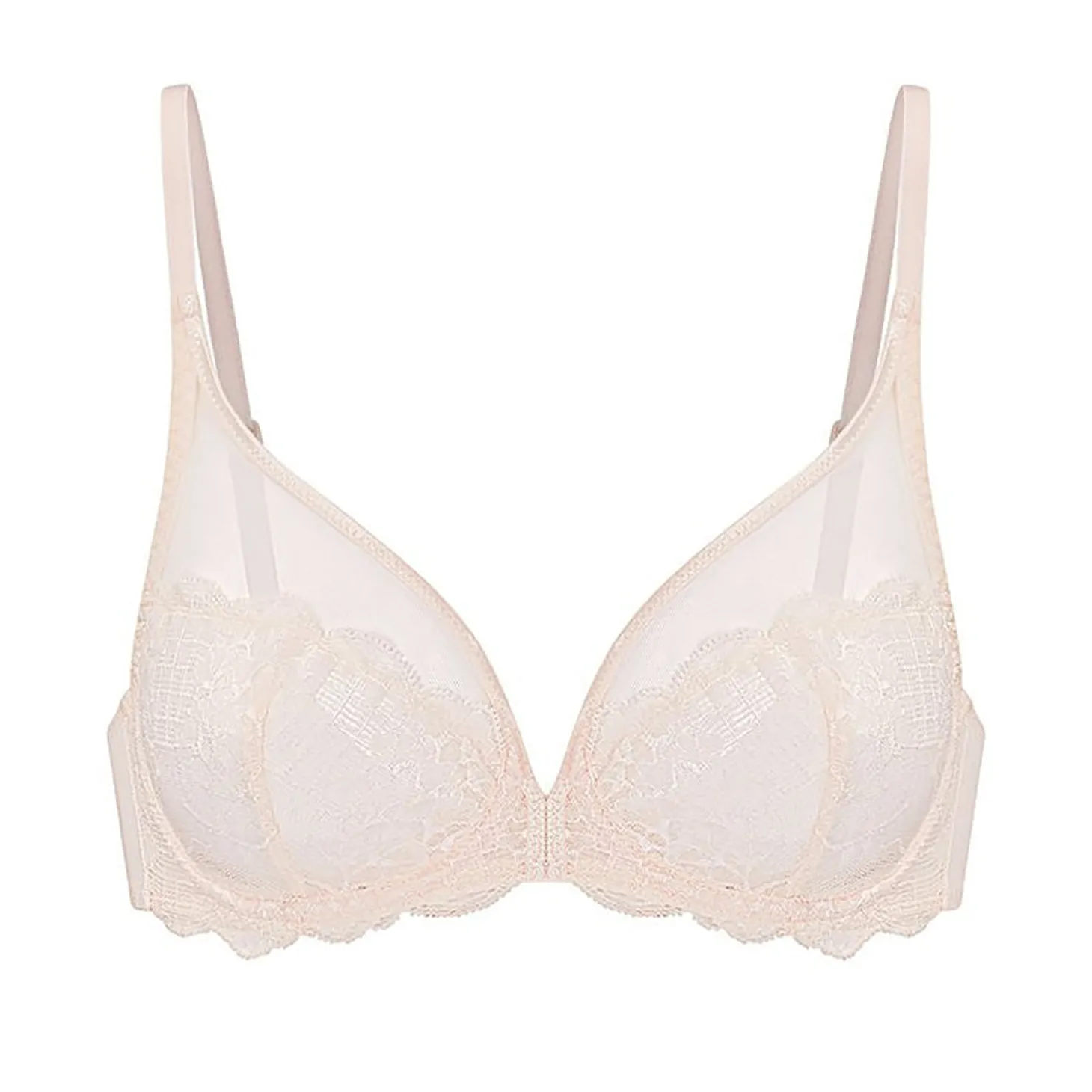- Design: Lace and tulle full coverage plunge bra with underwire. Lace lower cups and sheer tulle on upper cups. Neckline embellished with satin finishes. Underbust band accentuated with scalloped lace trim. Adjustable straps. Microfiber sides and back, lined from D cup. Oeko-Tex® certified materials.