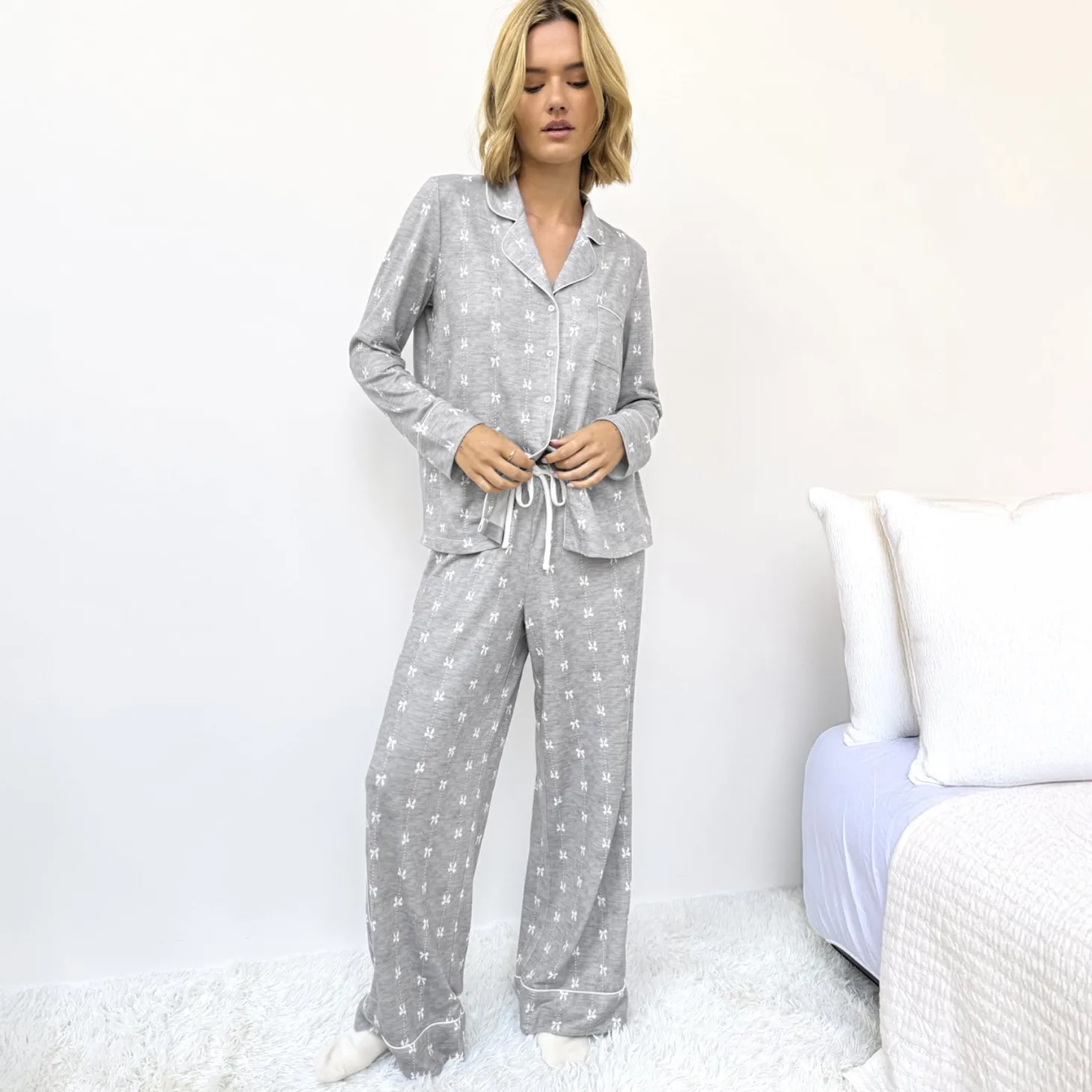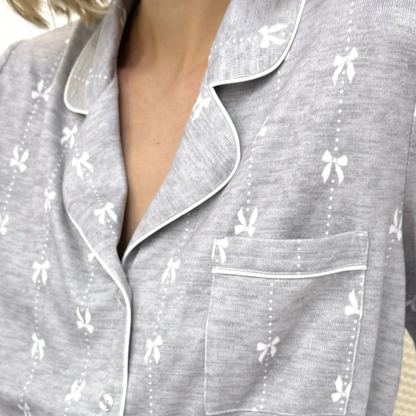 Relax in timeless comfort with this soft grey bow-print pyjama set. The charming white bow pattern and silky piping add a touch of femininity, while the cozy fabric and easy fit make it perfect for lounging or drifting off to sleep in effortless style.